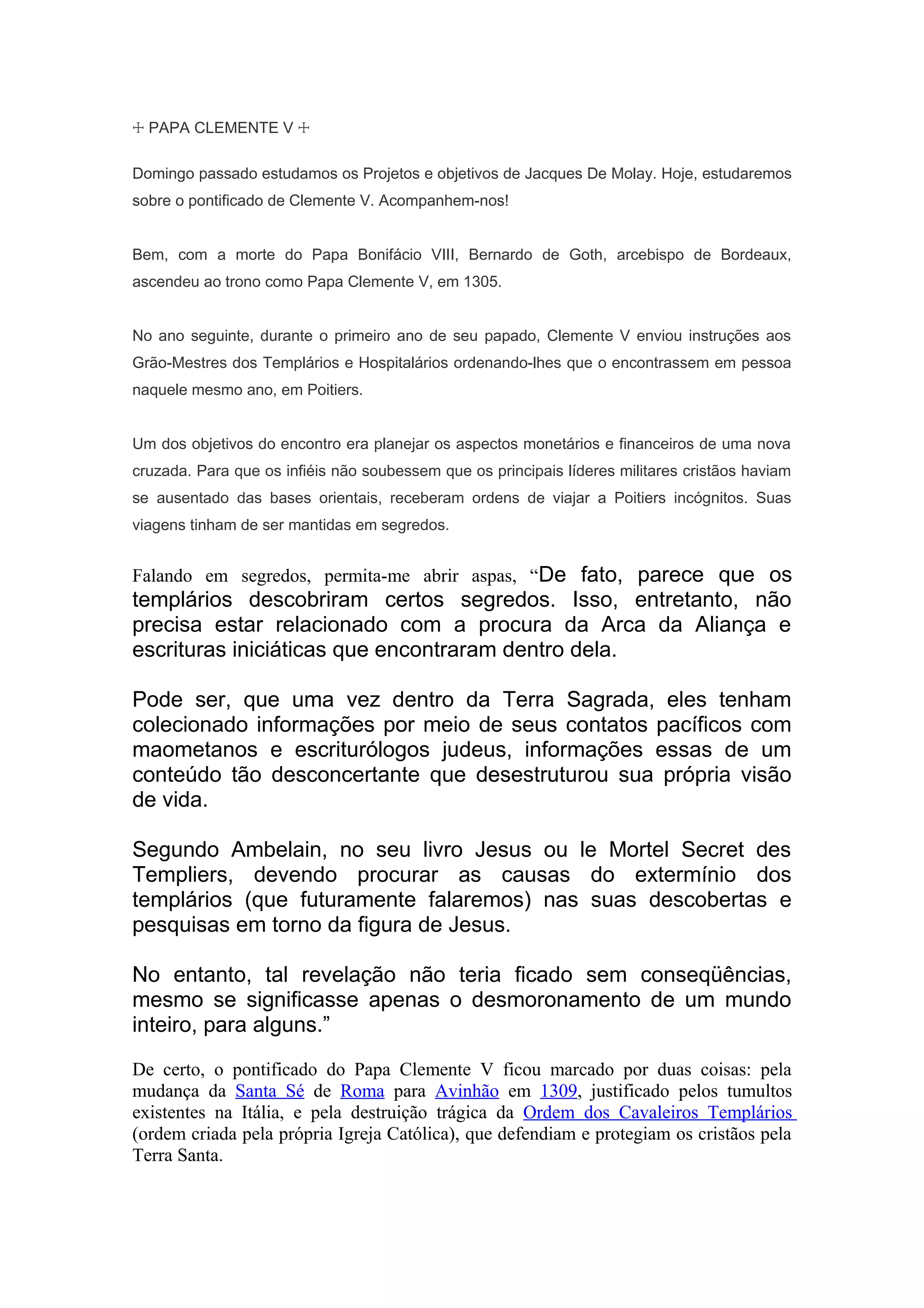 Clemente V se tornou Papa em 1305 após a morte de Bonifácio VIII. No ano seguinte, ele convocou os Grão-Mestres dos Templários e Hospitalários para uma reunião secreta em Poitiers para planejar uma nova cruzada. O pontificado de Clemente V também foi marcado pela transferência da Santa Sé para Avinhão em 1309 e pela destruição da Ordem dos Templários em 1312.