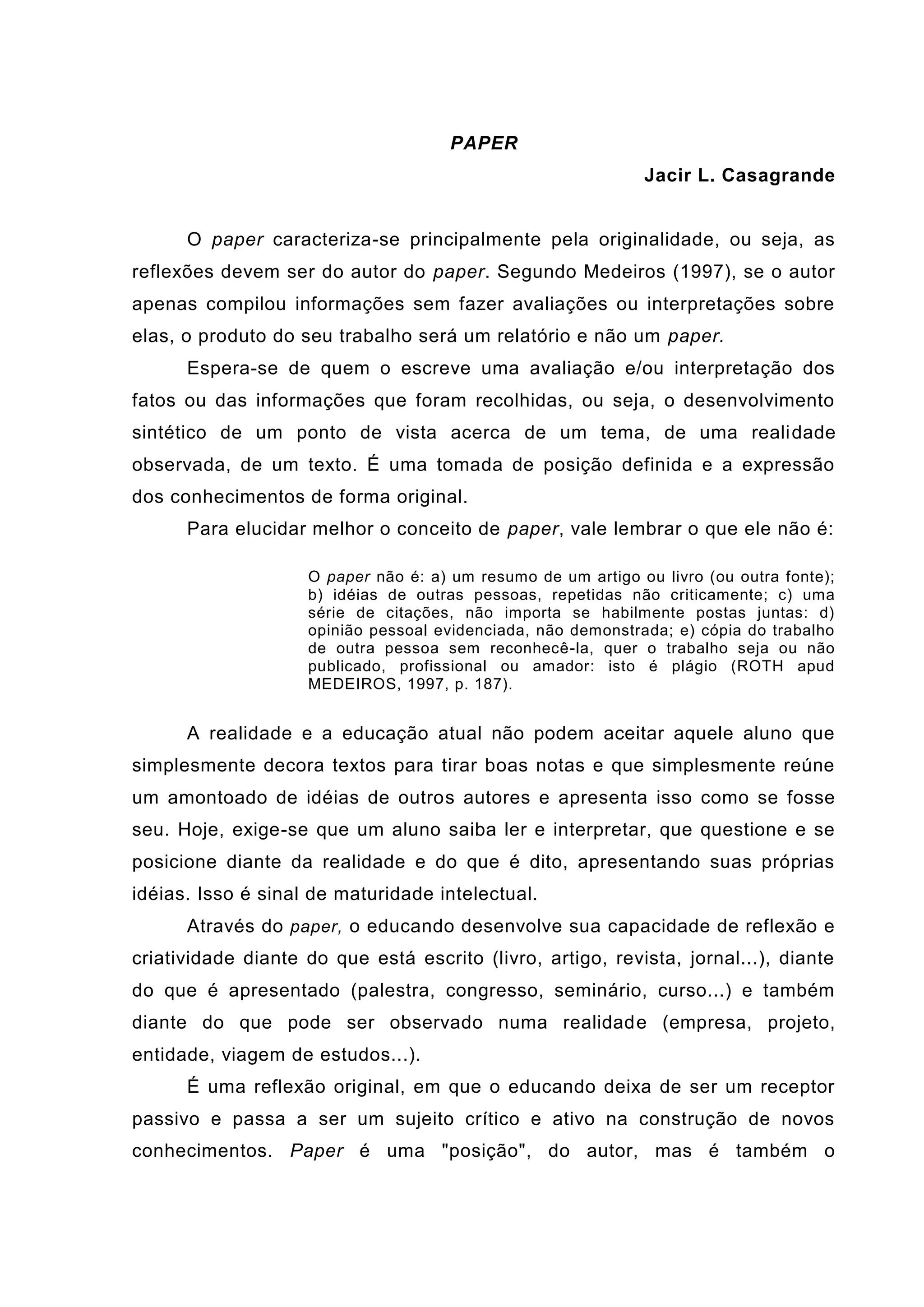 O documento discute o conceito de paper e suas características. Um paper deve apresentar reflexões e interpretações originais do autor sobre um tema, e não apenas compilação de informações de outras fontes. Além disso, o documento diferencia paper de outros tipos de trabalhos acadêmicos como resumos, relatórios e plágio.