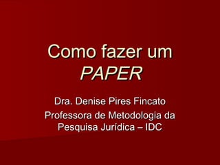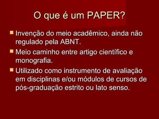 Este documento fornece instruções sobre como elaborar um paper acadêmico, incluindo seus elementos pré-textuais, textuais e pós-textuais, além de detalhes sobre formatação, citações e referências. O paper é definido como um trabalho entre artigo científico e monografia, utilizado para avaliação em cursos de pós-graduação. São descritos passos como anteprojeto, busca de materiais, prazo mínimo de um mês, extensão de 15 a 20 páginas e elementos como introdução, desen