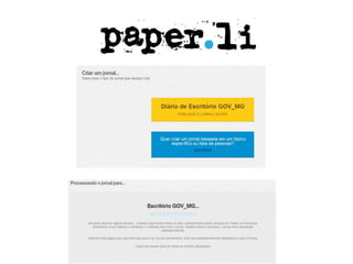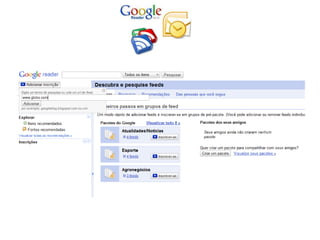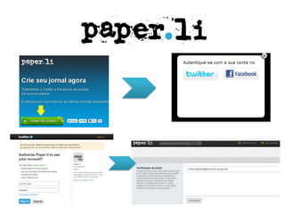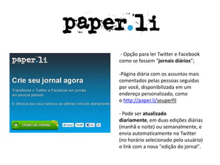 O documento descreve duas ferramentas para acompanhar notícias e redes sociais: o Paper.li, que cria um "jornal diário" com os assuntos mais comentados nas redes sociais de um usuário; e o Google Reader, que permite acompanhar feeds RSS de sites favoritos e compartilhar artigos com amigos.