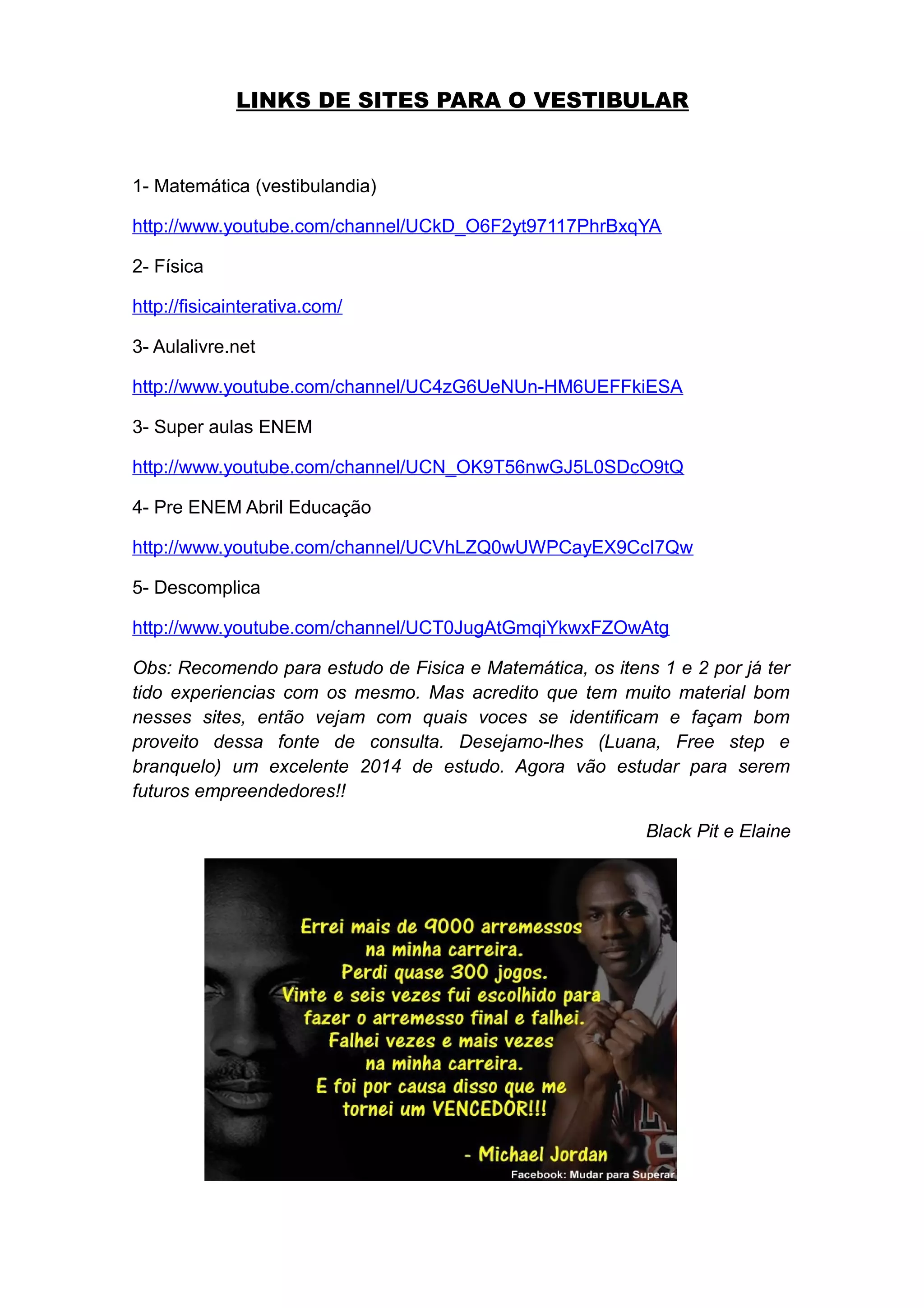 O documento lista 5 sites com links para vídeos de conteúdos de Matemática, Física e outros assuntos do vestibular, e recomenda especialmente os sites de Matemática e Física, desejando boa sorte aos estudantes para o vestibular e futuro.