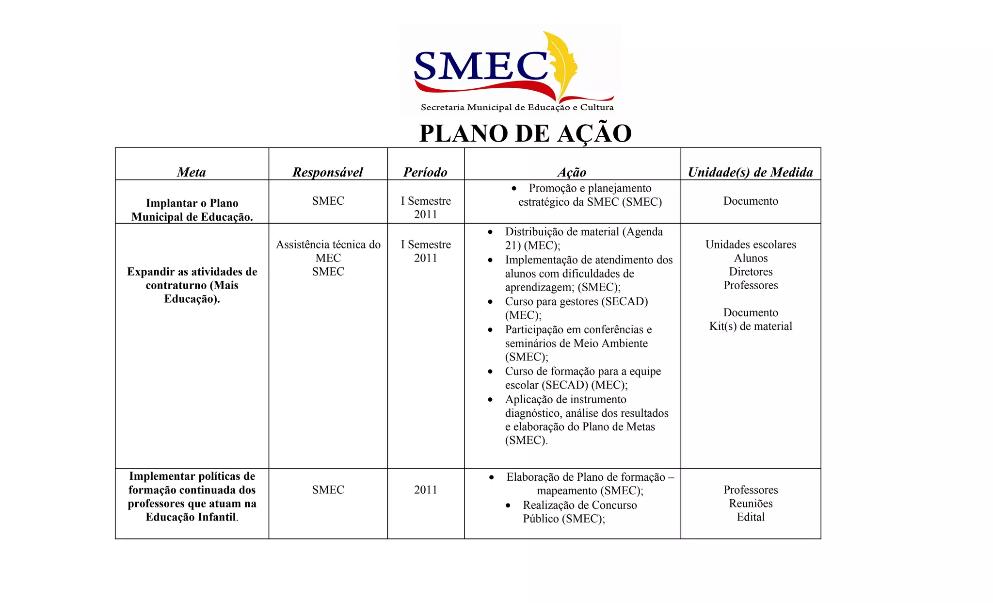 O documento descreve o plano de ação da Secretaria Municipal de Educação para 2011, com metas como implantar o Plano Municipal de Educação, expandir atividades de contraturno, implementar políticas de formação continuada de professores e implantar salas de recursos multifuncionais. As ações incluem promoção e planejamento estratégico, distribuição de material didático, realização de cursos e monitoramento de indicadores educacionais.