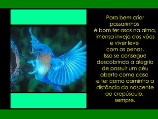 Cuidar de passarinhos requer liberdade, contato com a natureza e apreciar as pequenas coisas da vida. Deve-se dar aos pássaros um espaço amplo para voar, escutar sons da natureza, desfrutar da luz do sol e da lua, e ter acesso a árvores, rios e outros elementos naturais. É importante observá-los de longe e respeitar sua independência.