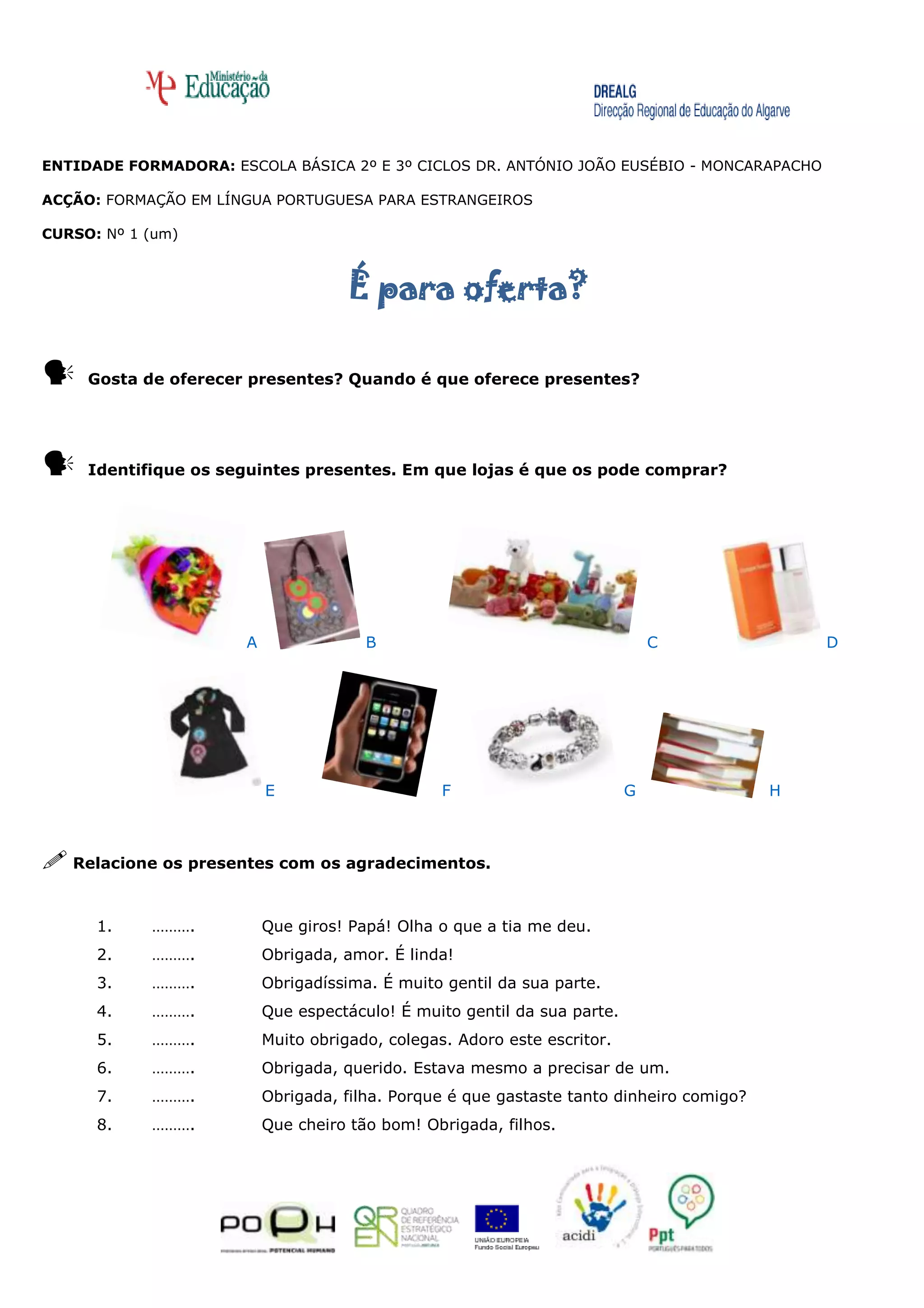 1) O documento apresenta um conjunto de exercícios sobre presentes, agradecimentos e preços para alunos estrangeiros aprenderem a língua portuguesa.