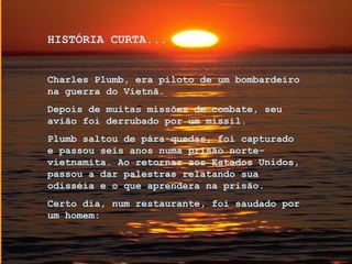 Charles Plumb, um piloto de bombardeiro na guerra do Vietnã, foi derrubado e capturado. Anos depois, ele foi saudado por um homem que dobrou seu pára-quedas quando saltou, salvando sua vida. A história reflete sobre como devemos valorizar e agradecer aqueles que fazem coisas importantes por nós, mesmo que não saibamos quem são.