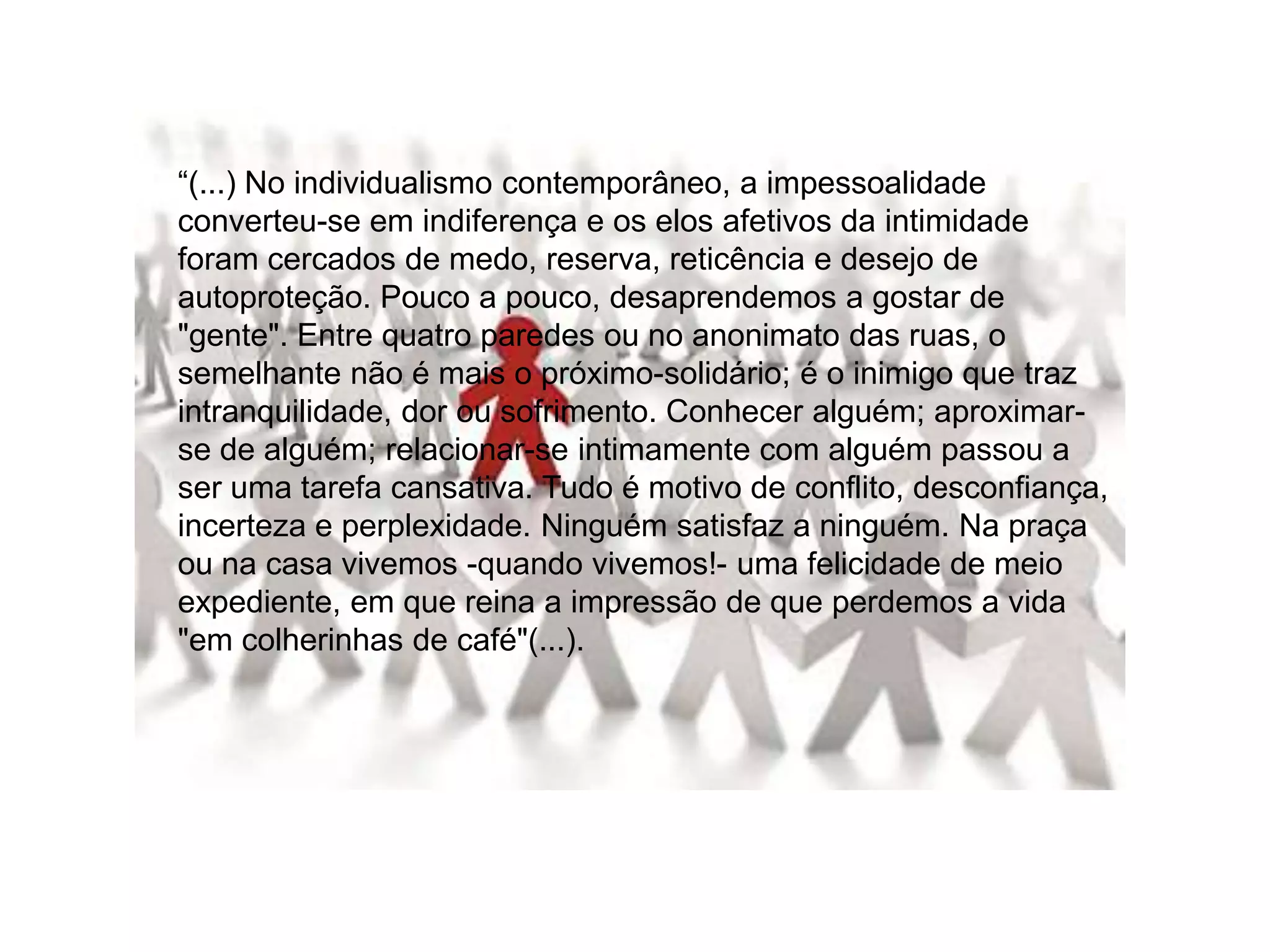 O documento discute como o individualismo contemporâneo levou as pessoas a se sentirem indiferentes umas às outras e desconfiadas nos relacionamentos. Os laços afetivos da intimidade são cercados por medo e reserva. As pessoas aprenderam a não gostar mais umas das outras e veem os desconhecidos mais como ameaças do que como próximos. Relacionar-se intimamente com os outros se tornou uma tarefa cansativa marcada por conflitos e incertezas.