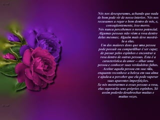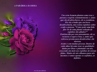 A parábola descreve um homem que plantou e cuidou de uma rosa, mas ao ver seus espinhos pensou que nada de bom poderia vir dela e parou de regá-la, fazendo-a morrer sem desabrochar. Da mesma forma, as pessoas se concentram nos próprios defeitos e não percebem seu potencial, precisando de alguém para mostrar a "rosa" dentro delas.