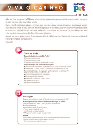 O documento descreve um projeto da EPTV chamado Parada Pet, que é um evento para donos de animais de estimação em Ribeirão Preto em outubro de 2017. O projeto oferece patrocínio de empresas através de exposição de marca na arena do evento, em mídia online, impressa e de rádio. Detalha os benefícios do patrocínio, público-alvo, dados demográficos, mídias disponíveis e valores.