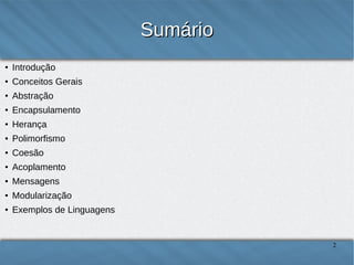 O documento discute o paradigma de programação orientado a objetos. Ele define conceitos como classe, objeto, método, atributo, herança, encapsulamento e polimorfismo. O documento também fornece exemplos de como esses conceitos são implementados em linguagens orientadas a objetos como C++ e Java.