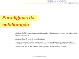 O documento aborda a transição de paradigmas da colaboração e a mudança de comportamentos na atuação hierárquica. Ele enfatiza a importância do compartilhamento de conhecimento e a ressignificação de conceitos como ruído e conhecimento tácito. Além disso, discute a motivação intrínseca e os diferentes papéis que surgem no trabalho colaborativo.