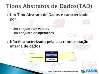 O documento discute os conceitos de Tipo Abstrato de Dados (TAD). Um TAD é caracterizado por um conjunto de valores e operações, mas não por sua representação interna de dados. Um TAD deve ter um contrato especificando seus atributos e operações, sem definir a representação ou algoritmos. Isso permite separação de interesses entre implementação e uso do TAD.