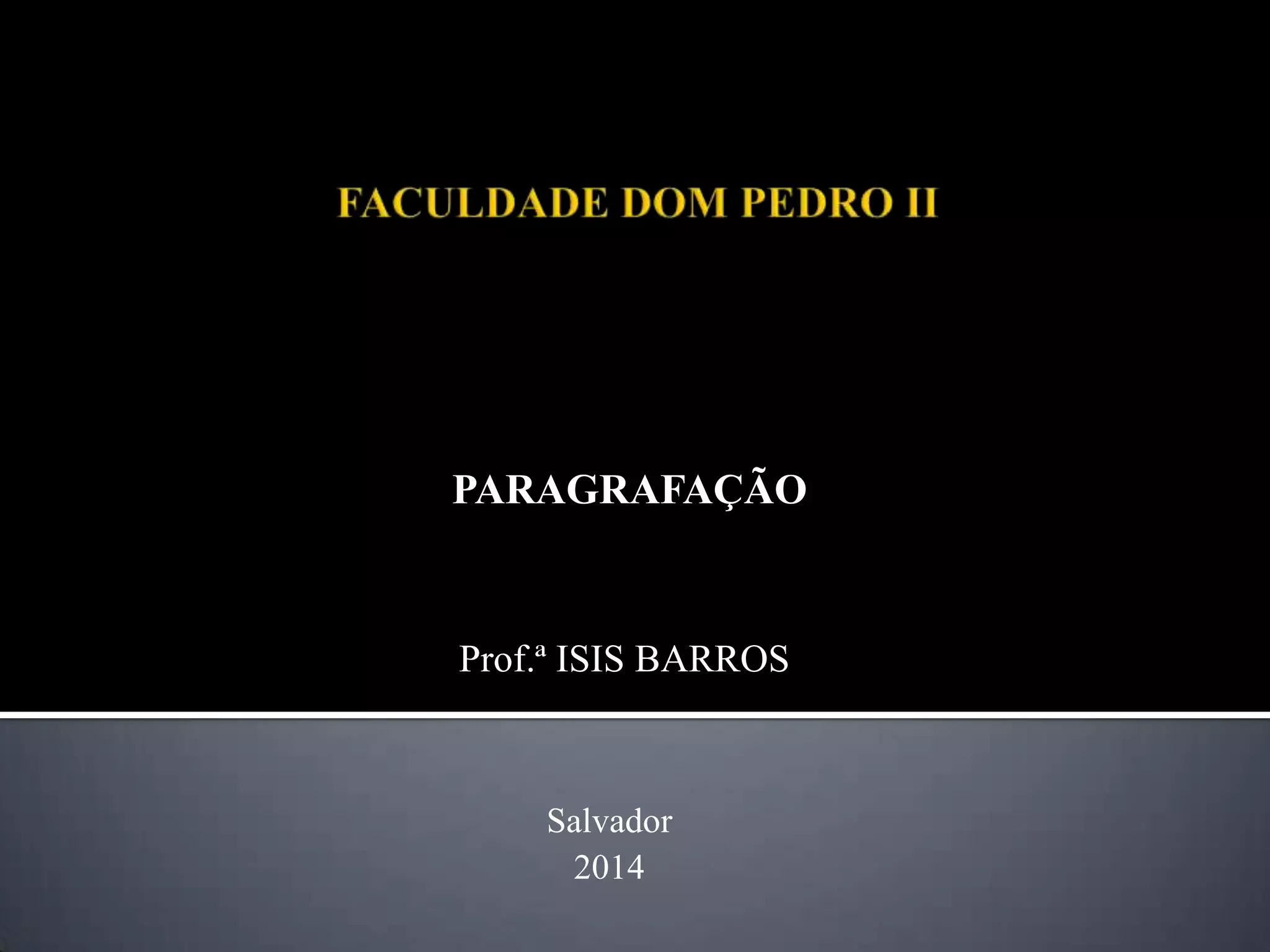 O documento discute os principais aspectos da parágrafação como: a organização das ideias em parágrafos com um tema central; o recuo à esquerda e linha em branco entre os blocos; e a ausência de regras rígidas, devendo-se priorizar a unidade, coerência e clareza. Também apresenta exemplos de sequências tipológicas em uma carta pessoal com diferentes tipos de parágrafos como descritivo, narrativo, expositivo e injuntivo.