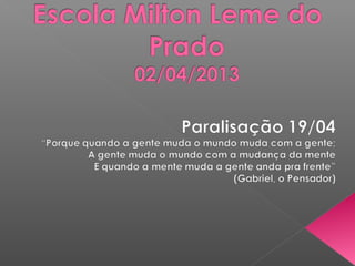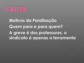 O documento discute as razões para uma paralisação de professores, incluindo salários baixos, jornadas de trabalho longas e falta de respeito. Ele argumenta que os professores não devem ter medo de perder seus empregos e devem lutar por melhores condições de trabalho usando o sindicato como ferramenta. A greve é para beneficiar tanto os professores quanto os estudantes no longo prazo.