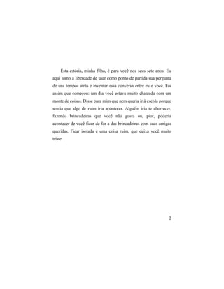 O documento é uma conversa fictícia entre uma mãe e sua filha de 7 anos. A mãe discute os desafios de cada fase da vida - infância, adolescência, juventude, idade adulta e idosice - para mostrar que cada idade tem problemas e recompensas. Ela diz que o importante é ter amor da família para enfrentar as mudanças durante o crescimento.