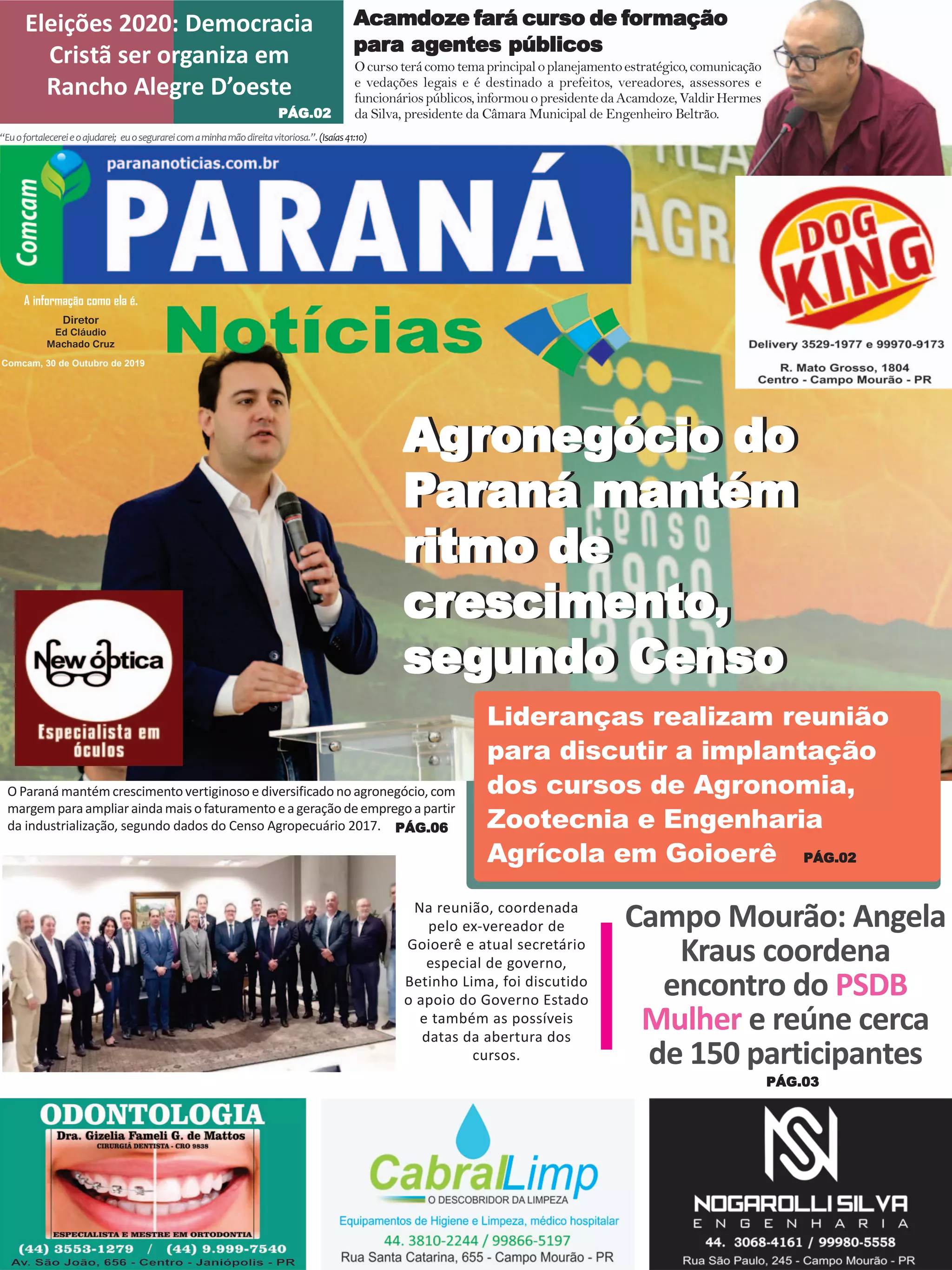 O documento discute o crescimento do agronegócio no Paraná de acordo com dados do Censo Agropecuário de 2017, mostrando que o estado lidera a produção de aves e mantém uma agricultura diversificada, com potencial para ampliar o faturamento e geração de empregos por meio da industrialização. O governador destaca a produção em pequenas propriedades e iniciativas para manter os jovens no campo.