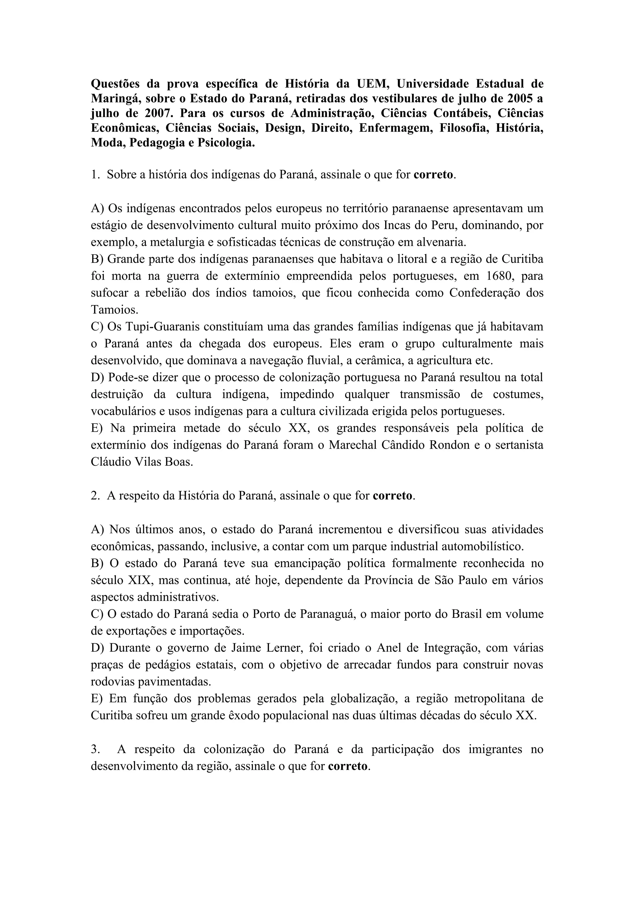 1) O documento contém 10 questões sobre a história do estado do Paraná retiradas de vestibulares aplicados entre 2005-2007. As questões abordam tópicos como a história dos indígenas, colonização, imigração, produção cafeeira e conflitos armados no estado.