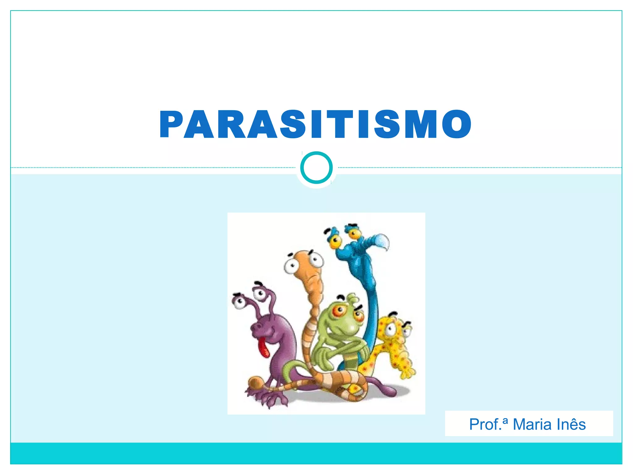 O documento discute o parasitismo, definindo-o como uma associação entre espécies diferentes na qual um ser, o parasita, se abriga e se alimenta às custas do outro, o hospedeiro. Também apresenta termos relacionados como agente etiológico, hospedeiro definitivo, ectoparasita e endoparasita.