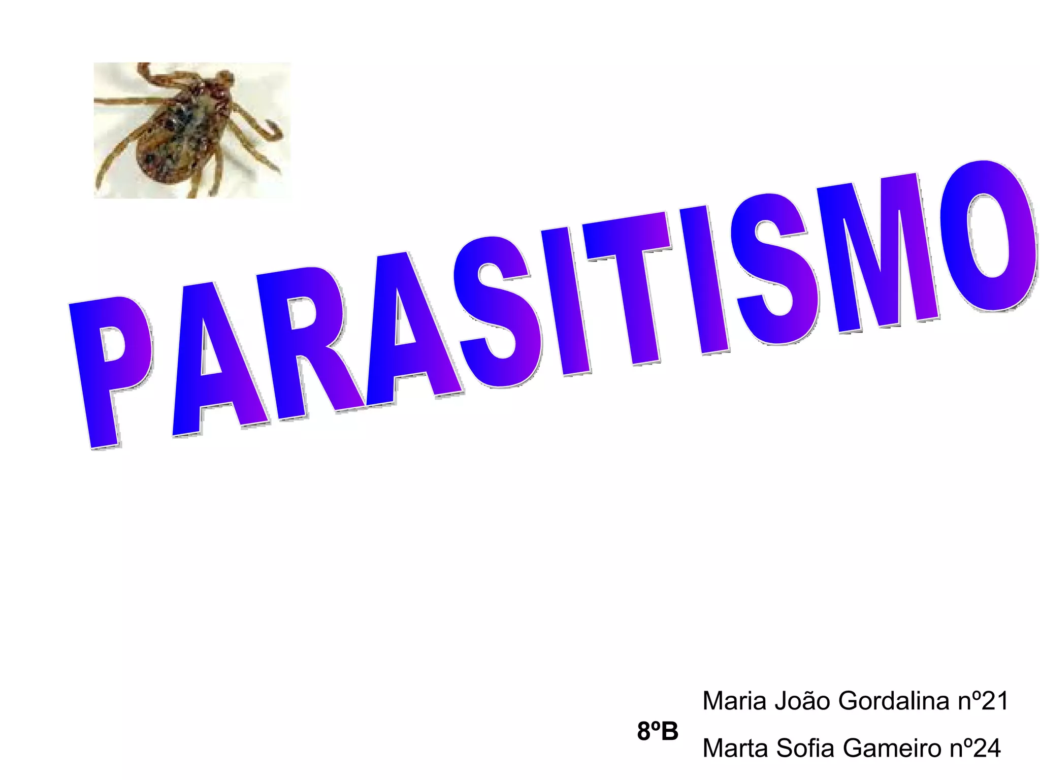 Este documento discute o parasitismo, definindo-o como uma relação onde um organismo (parasita) vive às custas de outro (hospedeiro), prejudicando-o. Apresenta dois tipos de parasitismo - endoparasitas, que vivem dentro do corpo do hospedeiro, e ectoparasitas, que vivem na sua superfície. Fornece exemplos como ténias, lombrigas e piolhos, explicando como afetam o homem e outros animais.