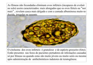 O documento descreve as características morfológicas de ovos e larvas de diferentes parasitas, incluindo: 1) ovos inférteis de Ascaris lumbricoides são alongados e revelam citoplasma granuloso; 2) ovos de Enterobius vermicularis são assimétricos com uma face achatada; 3) larvas rabditóides de Ancylostomidae possuem esôfago dividido em três partes.