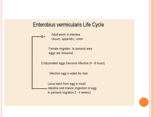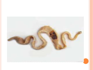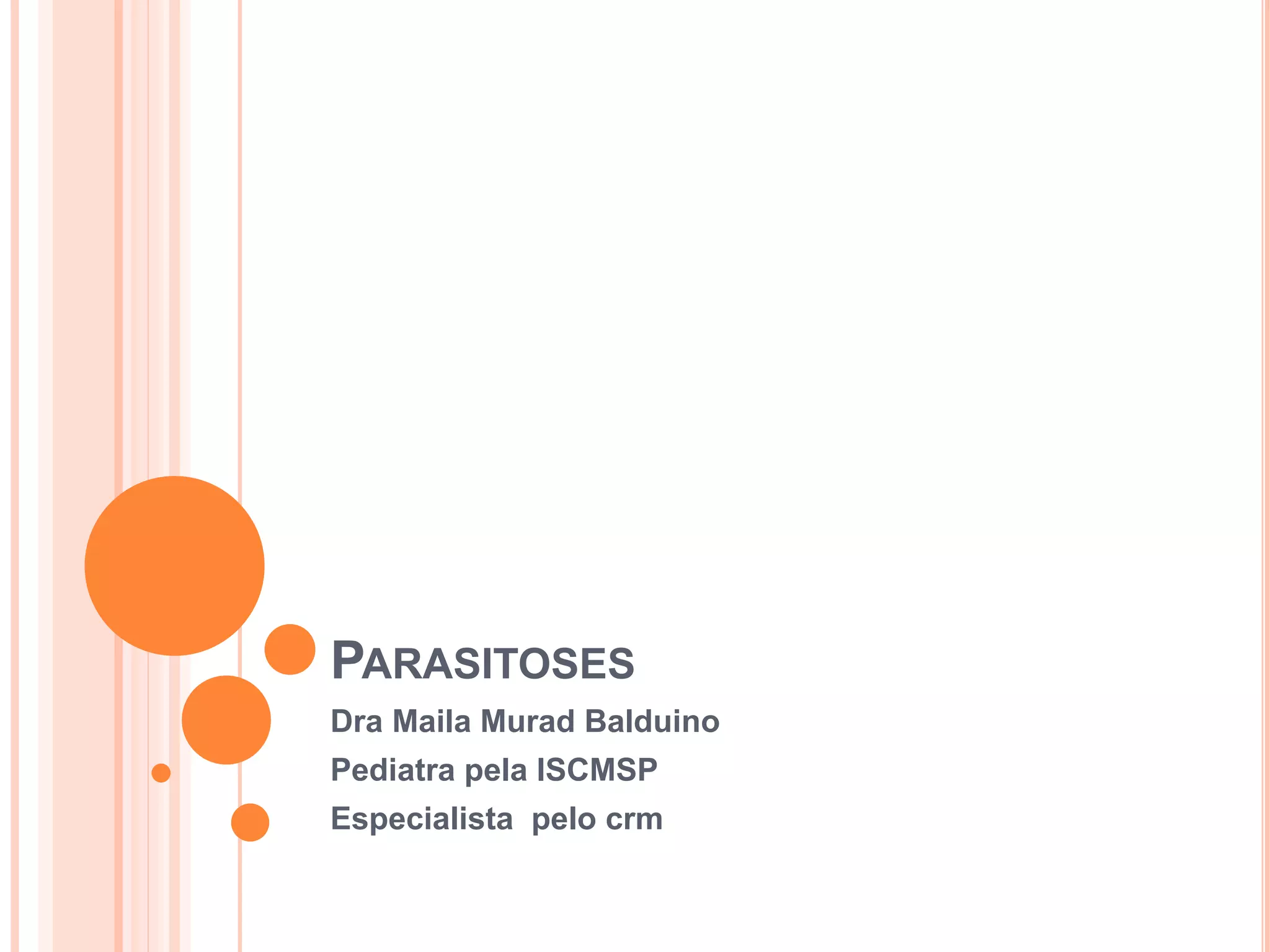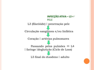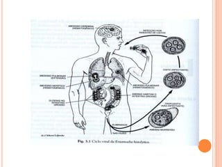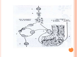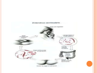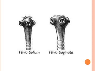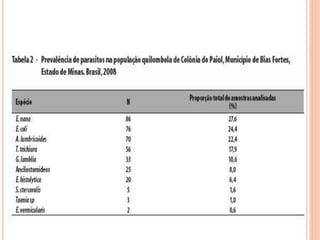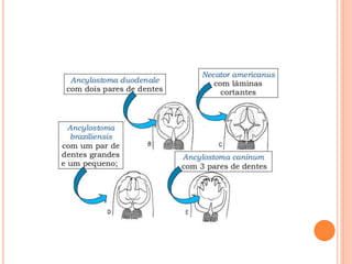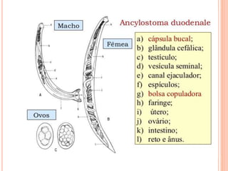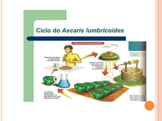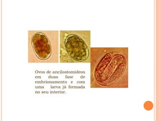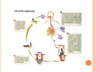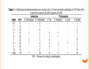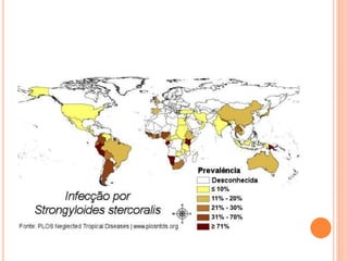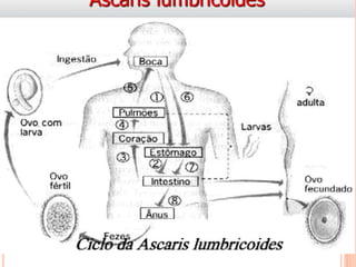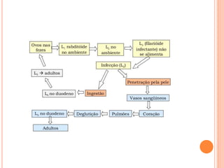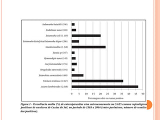 O documento resume as principais parasitoses que acometem seres humanos, incluindo amebíase, giardíase, ancilostomíase, ascariíase, estrongiloidíase, toxocariase, teníase, cisticercose, definindo cada doença, seu ciclo de vida, manifestações clínicas, diagnóstico e tratamento. O texto fornece informações detalhadas sobre a epidemiologia, transmissão e prevenção dessas parasitoses.