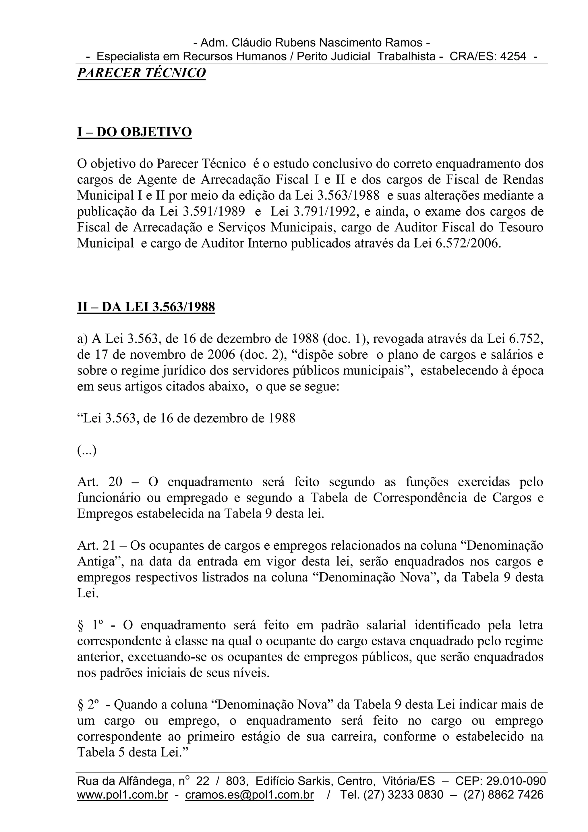 O documento descreve as atribuições e requisitos dos cargos de Fiscal de Rendas Municipais I e II e Fiscal de Arrecadação Municipal I e II conforme a Lei 3.563 de 1988. As atribuições incluíam auxiliar na fiscalização de estabelecimentos, coleta de dados tributários, emissão de autos de infração. Os requisitos eram ensino médio completo e 1 ano de experiência para Fiscal de Rendas e esforço mental esporádico para ambos.