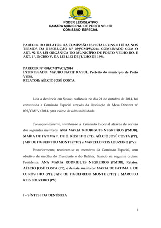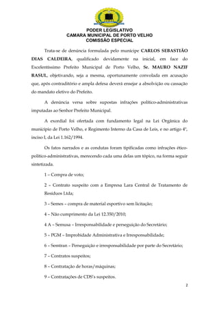 Este documento é o relatório de uma comissão especial da Câmara Municipal de Porto Velho analisando uma denúncia contra o prefeito Mauro Nazif Rasul. O relatório resume cada uma das nove denúncias, opinando sobre se devem ser investigadas, arquivadas ou aguardar o posicionamento do Ministério Público. O relator conclui que alguns itens da denúncia merecem investigação para apurar possíveis infrações político-administrativas cometidas pelo prefeito.