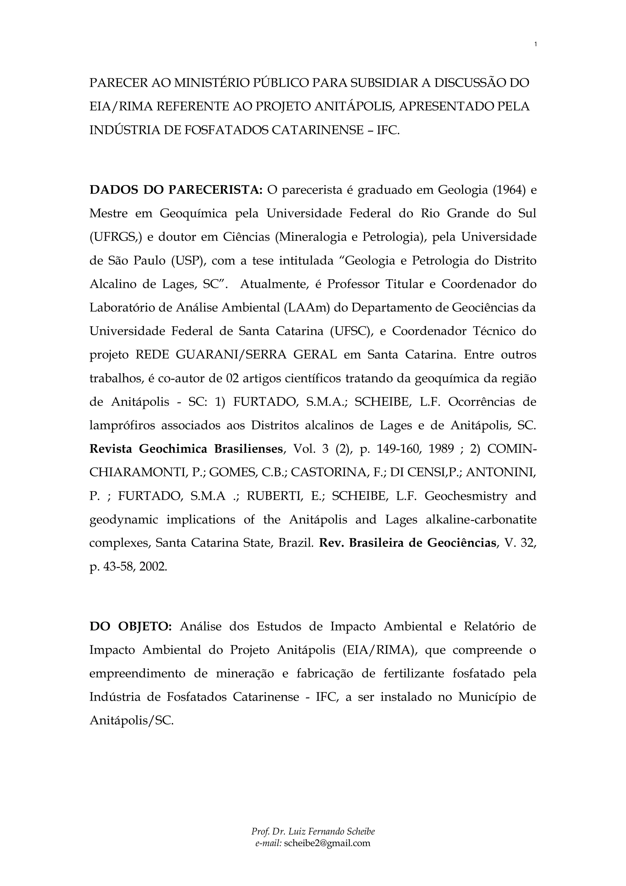 1) O documento analisa os possíveis impactos ambientais do Projeto Anitápolis da Indústria de Fosfatados Catarinense.