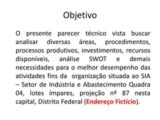 Este documento técnico resume a análise SWOT, investimentos de médio prazo e processos produtivos de uma empresa fictícia de alimentos orgânicos. Ele propõe a expansão da linha de produtos com novas opções de polpas, granola e iogurte gelado de açaí, requerendo nova máquina e freezer. Detalha os processos de produção de polpa, néctar e iogurte de açaí, bem como a logística de entrega dos produtos finalizados.