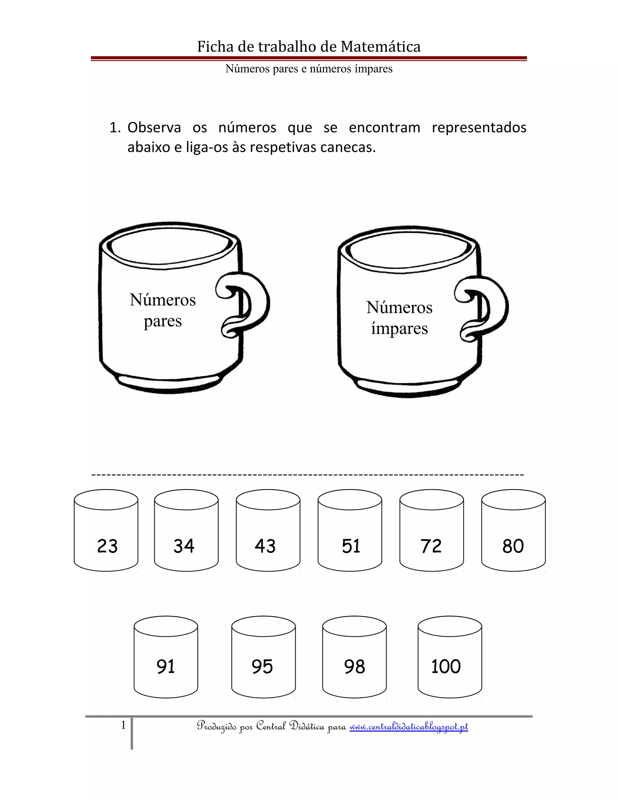 O documento classifica números em pares e ímpares, pedindo aos alunos para ligar cada número à respectiva caneca. Ensina a diferença entre números pares e ímpares para alunos do ensino fundamental.