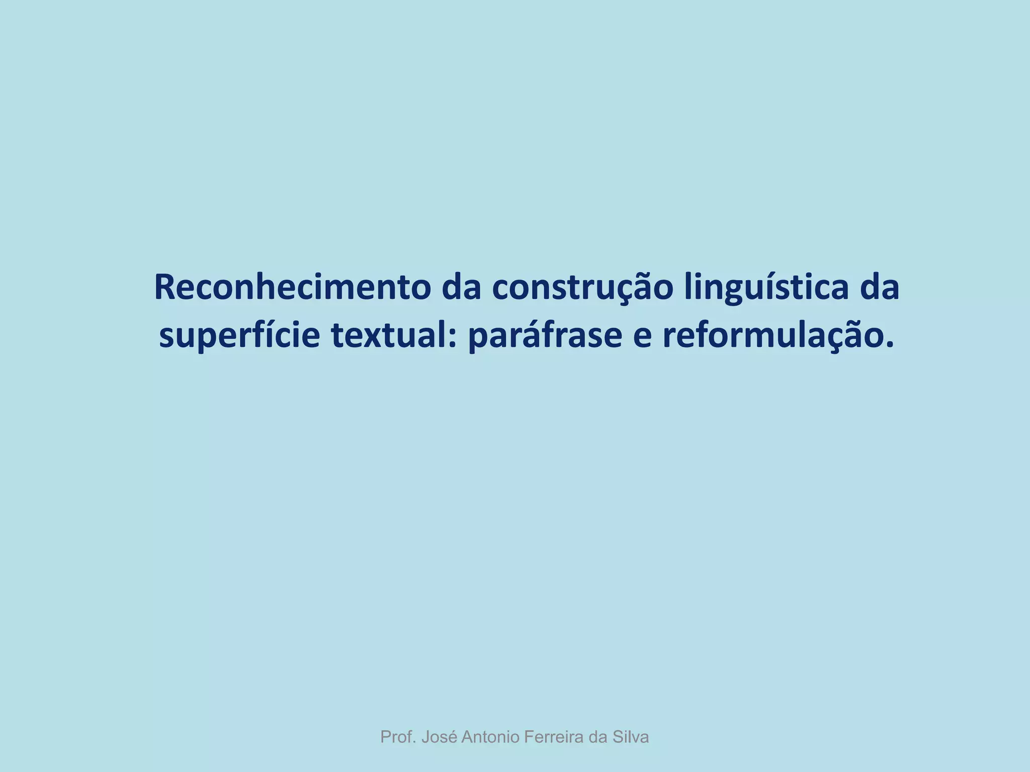 O documento discute paráfrase e reformulação de textos, explicando que são formas de contar o que foi lido ou ouvido com as próprias palavras, mantendo o sentido original. Também apresenta exemplos de paráfrase de frases e parágrafos para ilustrar o processo.