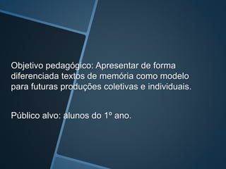 Este documento apresenta várias parlendas, trava-línguas e adivinhas para serem usadas em atividades pedagógicas com alunos do 1o ano. O objetivo é apresentar textos de memória que possam servir como modelo para futuras produções orais e escritas das crianças. Ao todo, são apresentadas 13 parlendas, trava-línguas e adivinhas curtas.