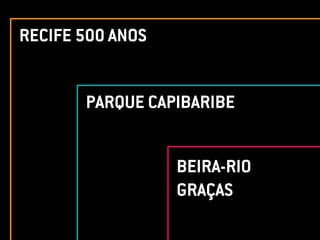 - O documento apresenta o plano estratégico "Recife 500 anos" com projetos estruturantes como o plano de drenagem, revitalização de áreas críticas, criação do Centro Cidadão e expansão do Parque Capibaribe.