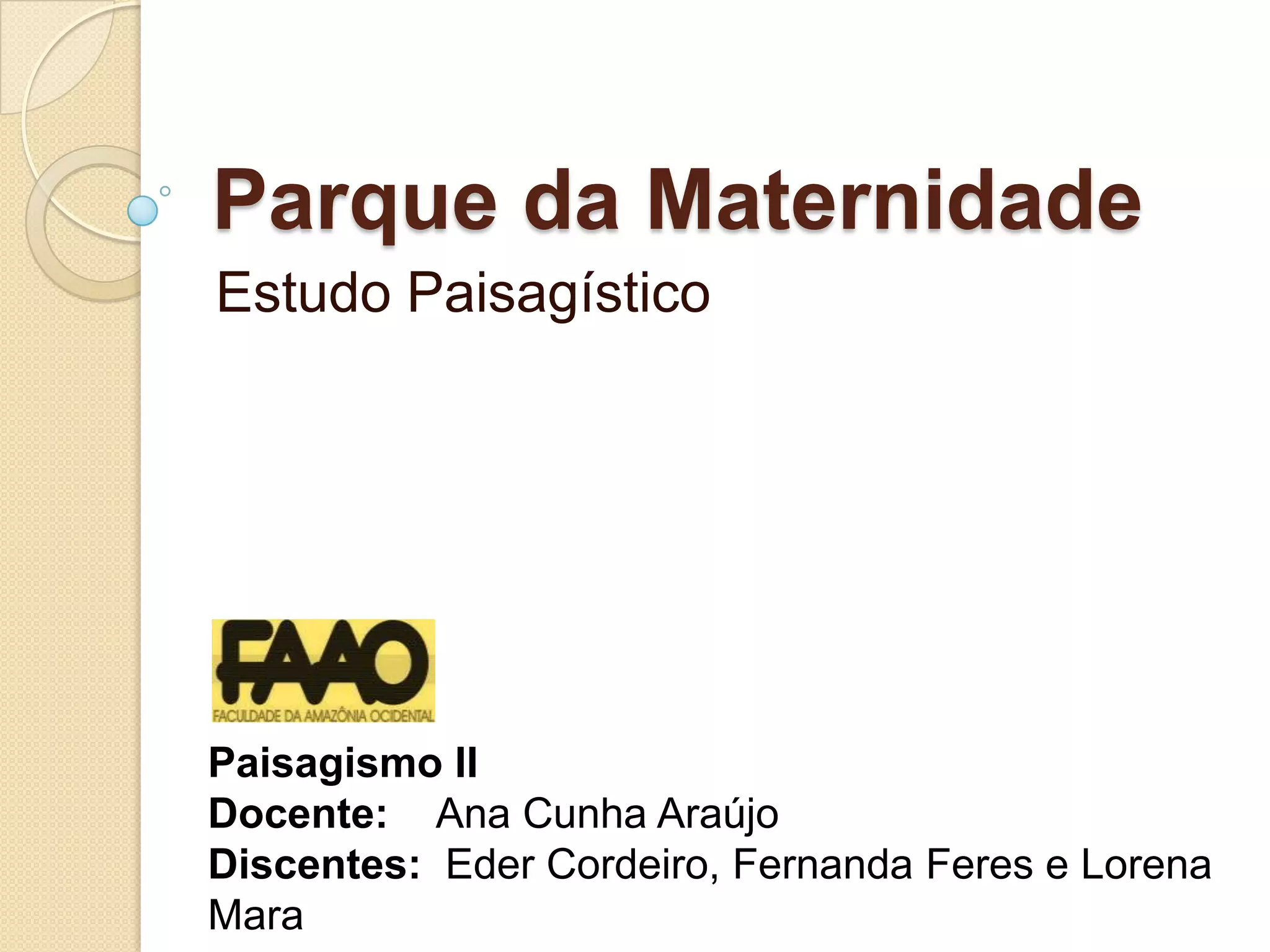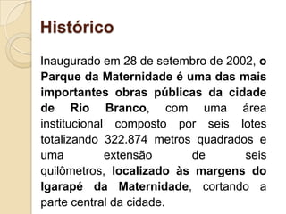 O Parque da Maternidade, inaugurado em 2002 em Rio Branco, abrange 322.874 m² e possui diversas estruturas e áreas de lazer, como quadras esportivas, ciclovias e paisagens variadas. O documento também destaca a vegetação do parque, apresentando uma variedade de espécies arbóreas, arbustivas e herbáceas, detalhando suas características e origens. Por fim, o parque é um espaço destinado ao lazer e à prática esportiva, servindo como um importante ponto de convivência urbana.