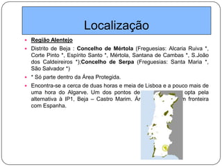 O documento apresenta uma descrição detalhada do Parque Natural do Vale do Guadiana, localizado na região do Alentejo, destacando sua geografia, clima, biodiversidade e património cultural. Enfatiza a importância ecológica da área, com diversos habitats e espécies raras, além de mencionar atividades econômicas e sugestões de turismo. O texto também ressalta o impacto demográfico na região e a relevância histórica da vila de Mértola.