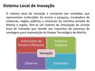 O documento apresenta o sistema local de inovação de Marília, que envolve várias instituições e empresas com o objetivo de implementar um parque tecnológico na região. Destaca a importância deste parque para promover ciência, tecnologia e inovação, criando um ambiente propício para empresas de base tecnológica e indústrias. A implantação do parque é vista como uma estratégia para fomentar o desenvolvimento econômico local e aumentar a competitividade das empresas da região.