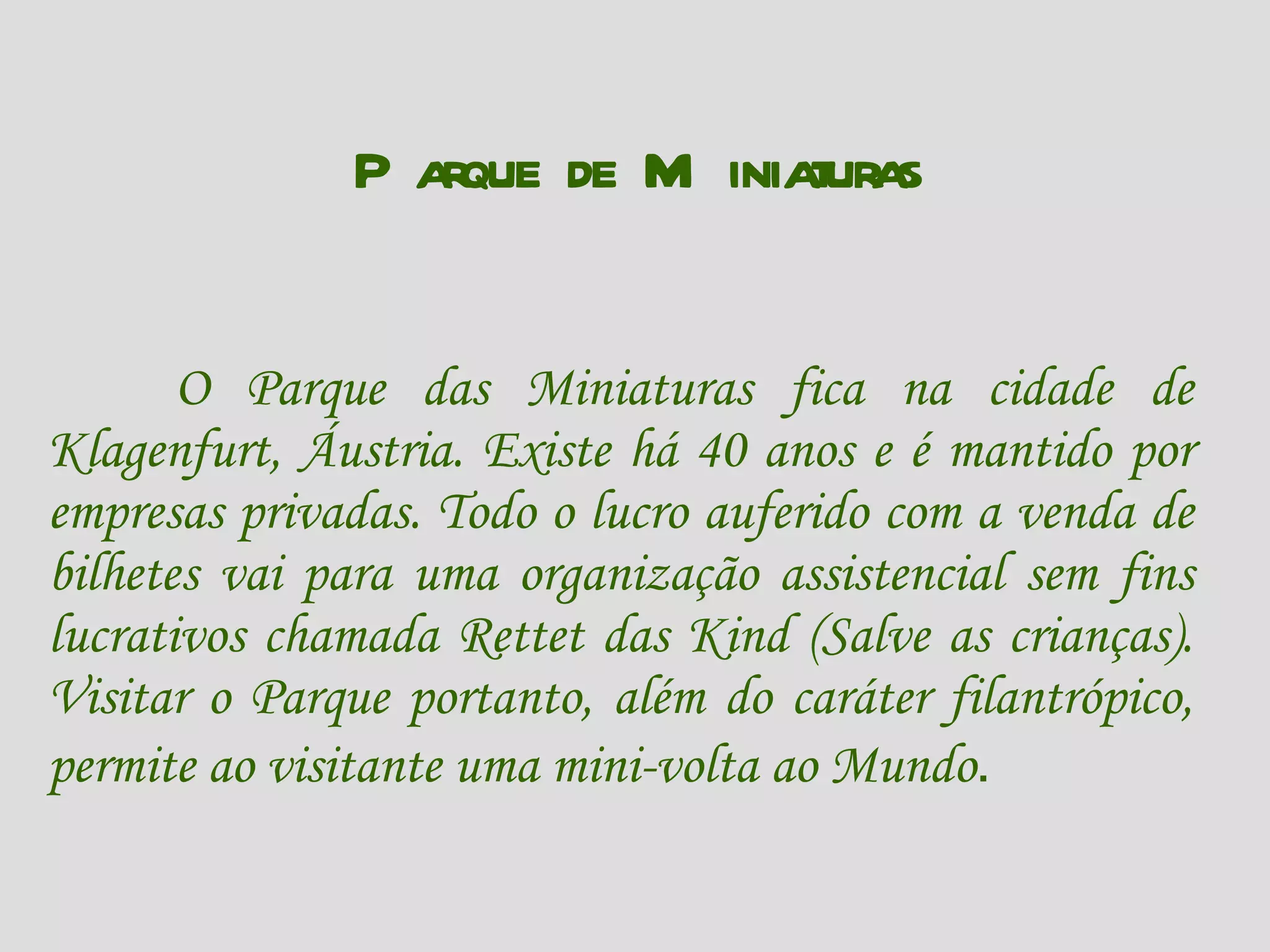 O Parque de Miniaturas na Áustria é mantido por empresas privadas há 40 anos e todo o lucro é doado para uma organização de caridade que ajuda crianças. Visitar o parque permite que as pessoas deem uma volta ao mundo em miniatura enquanto apoiam uma boa causa.
