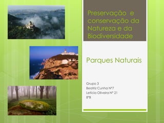 Este documento descreve dois parques naturais portugueses: o Parque Natural de Sintra-Cascais e o Parque Natural Litoral Norte. O documento detalha a localização, flora, fauna e espécies encontradas em cada parque.