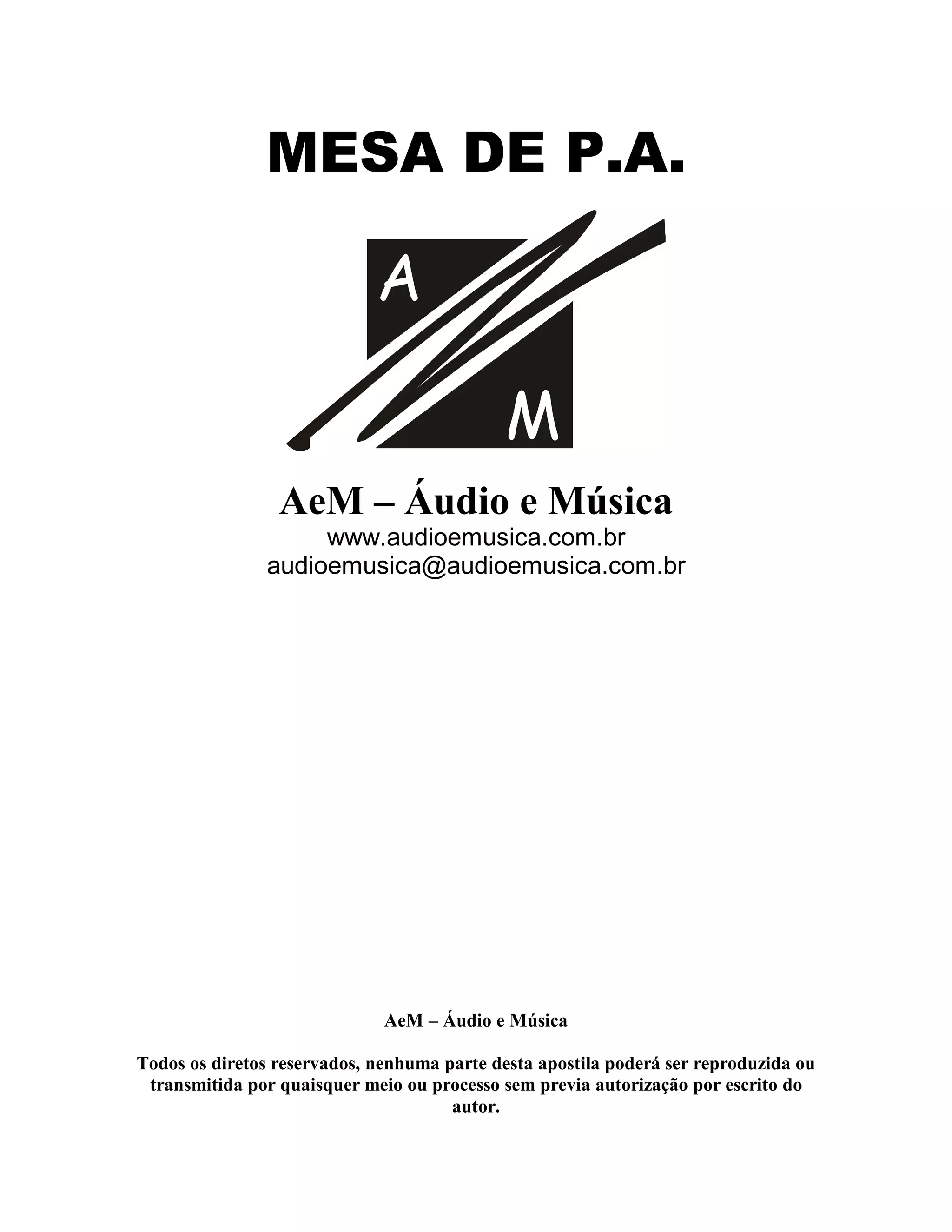 O documento discute equipamentos de áudio, incluindo mesas de som profissionais e seus componentes. Detalha os controles encontrados em mesas de som, como equalizadores, ganho de entrada e saída, além de explicar conceitos como insert, subsnake e multi cabos.