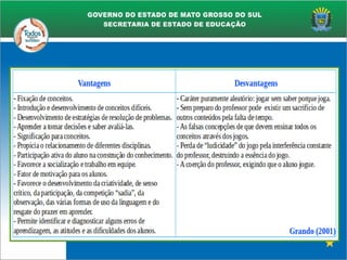 O documento discute os benefícios dos jogos educativos no processo de ensino-aprendizagem, argumentando que eles permitem a aprendizagem por experiência ao simular situações reais. Também aborda como os jogos podem fomentar a autoria estudantil e como a avaliação pode ser feita no contexto do uso de jogos educativos.
