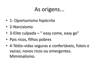 O documento lista diversas origens e causas para comportamentos antissociais e irracionais na sociedade moderna, incluindo oportunismo, narcisismo, medo, infantilidade, ignorância, arrogância, sede de poder, falsa filantropia, entre outros. Menciona também temas polêmicos explorados por esses grupos como aborto, porte de armas e ambientalismo radical.