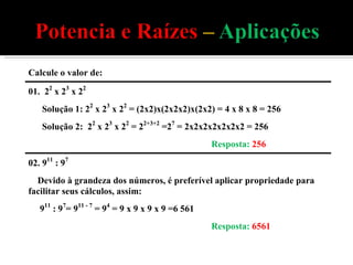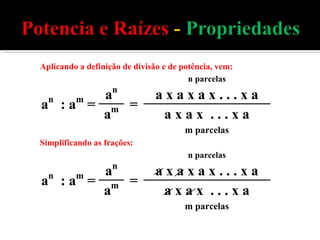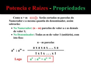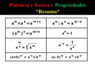 3) Cinco propriedades fundamentais de potenciação são descritas: da multiplicação e divisão de potências da mesma base, de potenciação de potências, de potenciação de produtos e divisões, e de potências com expoente zero.
