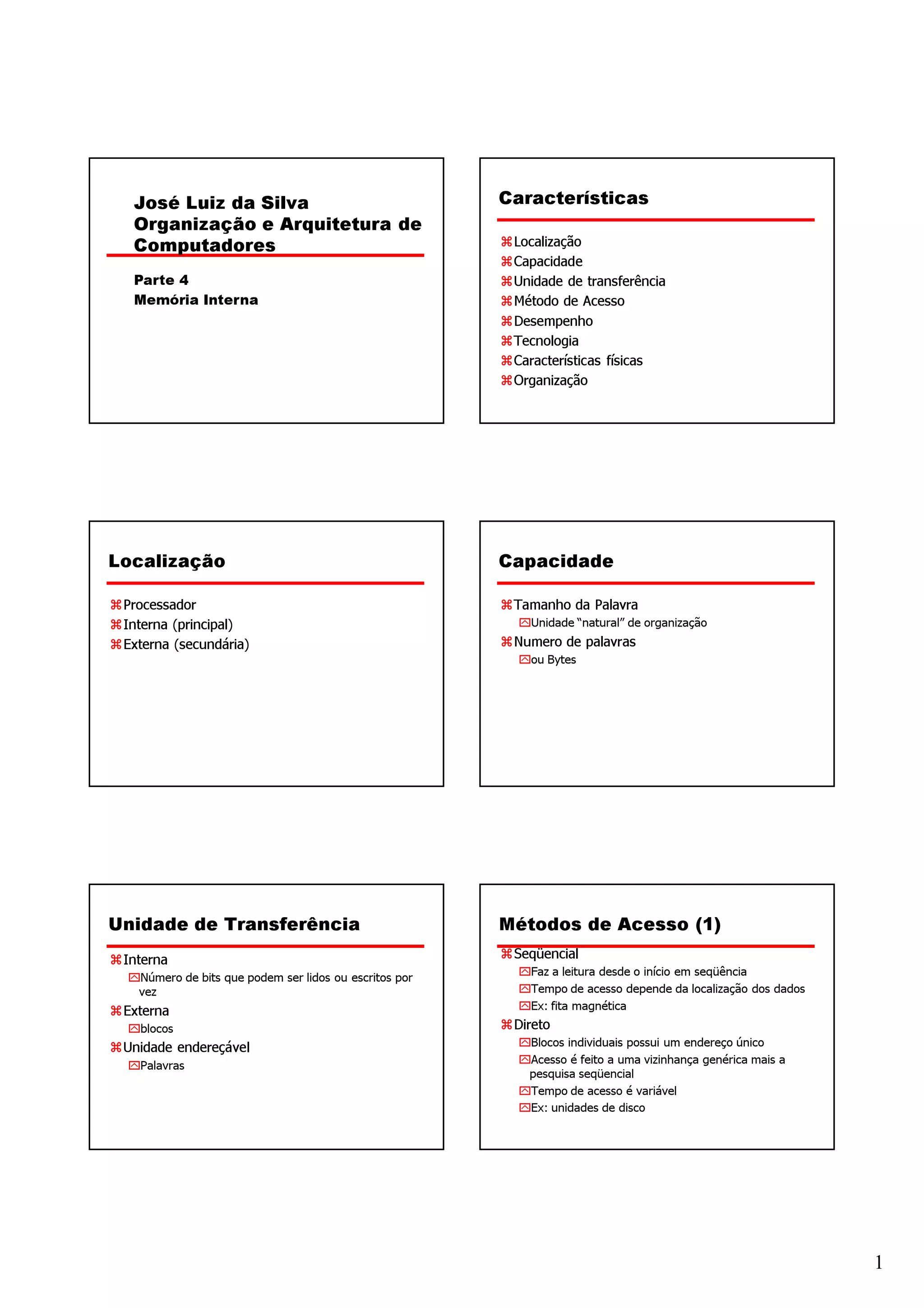 1) As características e hierarquia da memória, desde registradores até armazenamento externo;