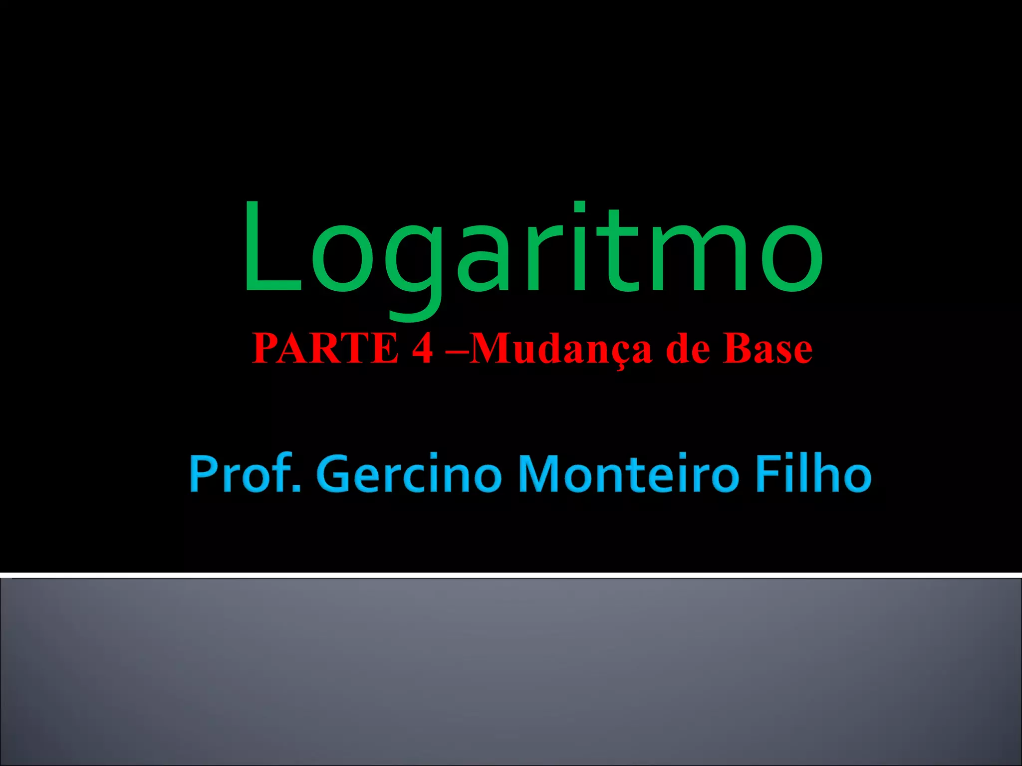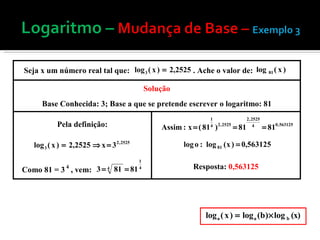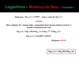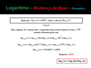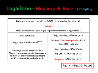 A mudança de base é necessária quando se conhece o logaritmo de um número em uma base, mas é preciso encontrá-lo em outra base. Isso pode ser feito aplicando a definição de logaritmo e usando a fórmula loga(b) = logc(b)/logc(a), que converte o logaritmo de uma base para outra. Exemplos ilustram como usar essa fórmula para mudança de base. Quando o número não pode ser decomposto na base original, tabelas de logaritmos ou planilhas eletrônicas pode