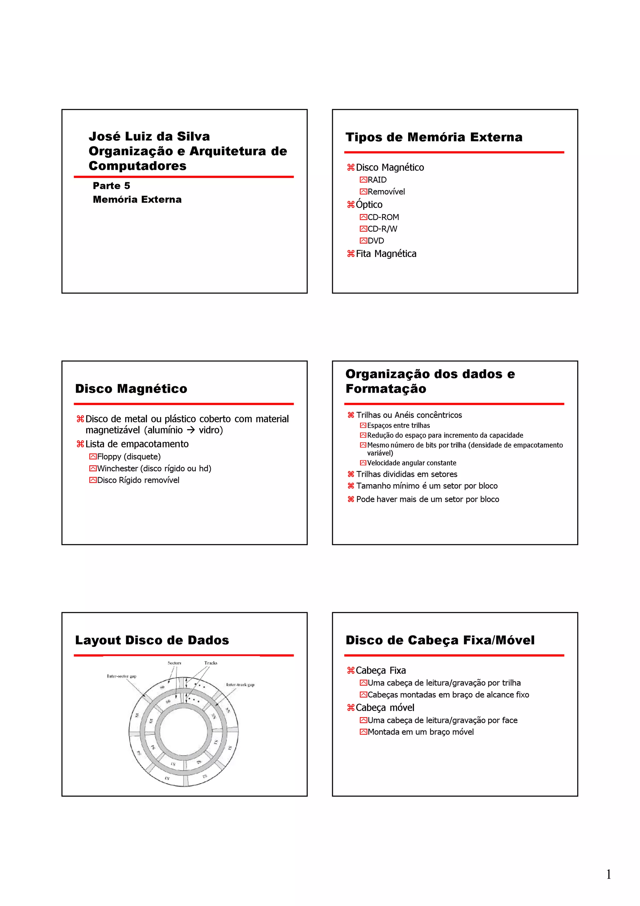 O documento descreve os principais tipos de memória externa, incluindo discos magnéticos, ópticos e fitas magnéticas. Detalha a organização de dados em discos magnéticos em trilhas e setores e explica como o RAID distribui dados entre vários discos físicos para fornecer redundância e aumentar a confiabilidade.