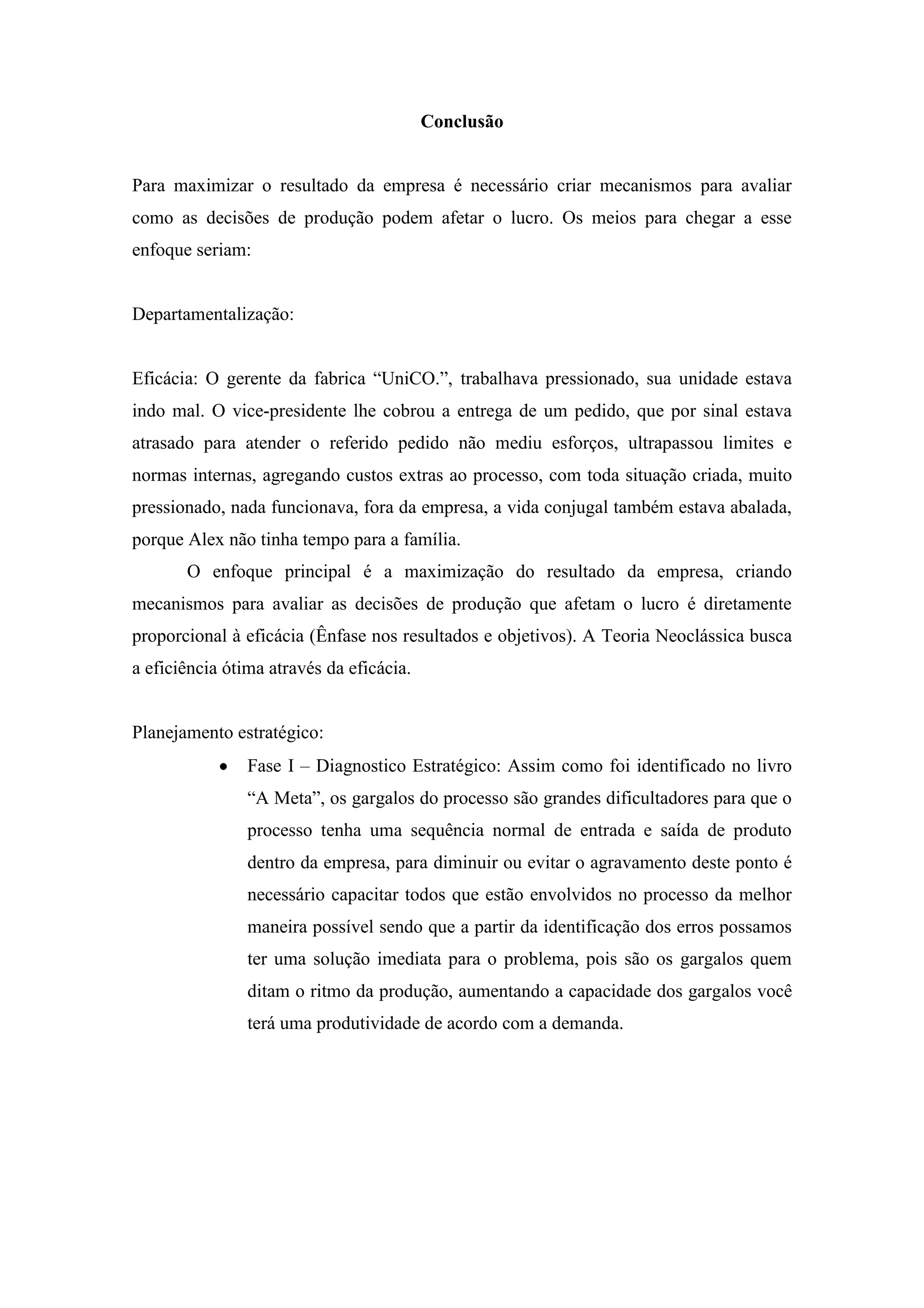 [1] O documento discute a importância de planejamento estratégico e avaliação de desempenho para maximizar os resultados de uma empresa, especificamente abordando os cinco estágios do planejamento estratégico. [2] Também analisa como a falta de objetivos claros e uniformidade nos processos prejudicou o desempenho da empresa retratada no livro "A Meta". [3] Defende que a ênfase em objetivos e resultados é essencial de acordo com a teoria neoclássica para alcançar eficiência.