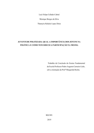 O trabalho de conclusão analisa a importância da juventude politizada na política brasileira, destacando sua influência e participação na construção do futuro da nação. Apresenta a atuação de jovens políticos e a relevância de manifestações estudantis como forma de expressão democrática. A pesquisa busca entender as percepções da juventude sobre política e promover uma reflexão sobre seu papel na sociedade.