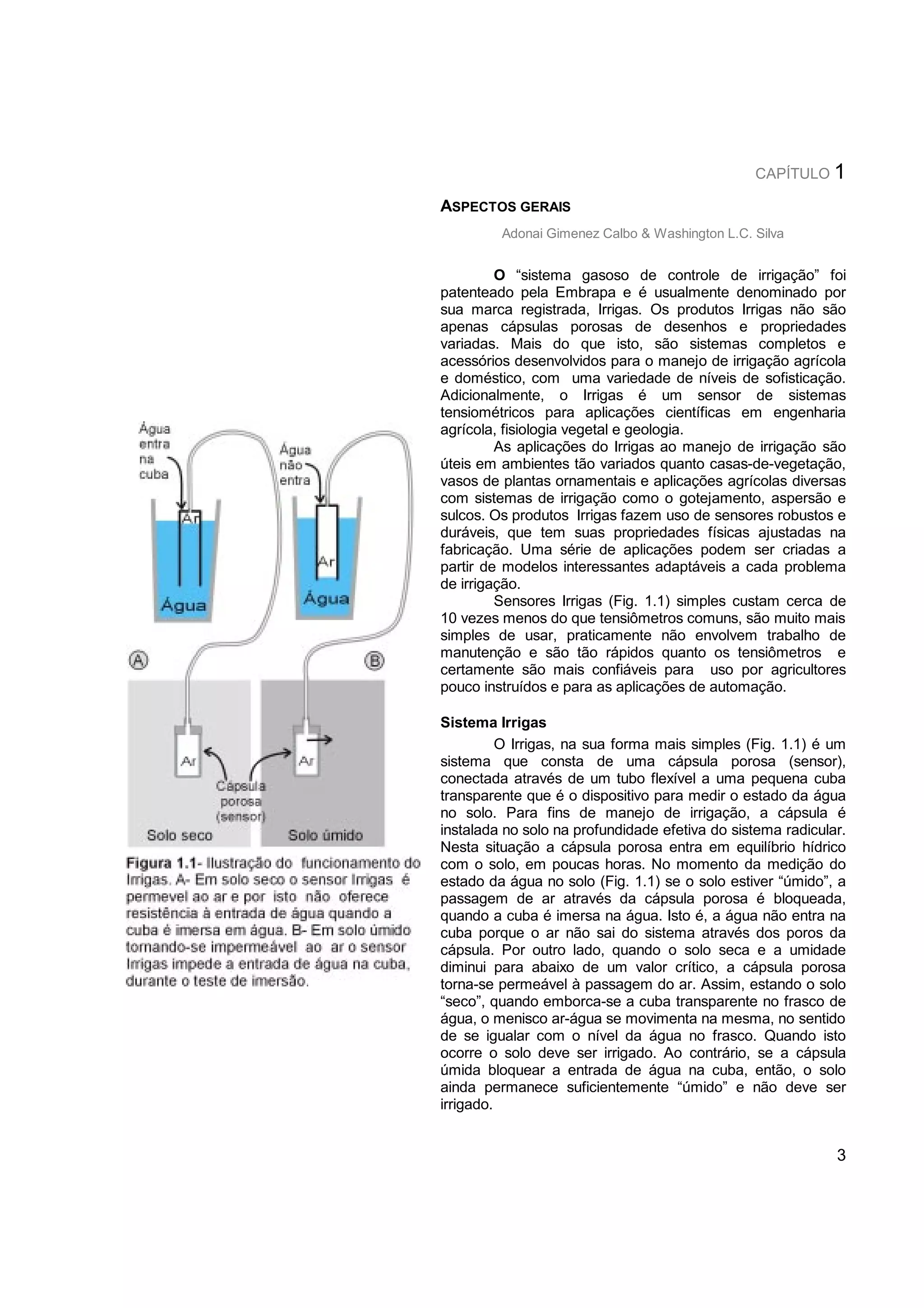 O documento discute o sistema Irrigas para controle de irrigação desenvolvido pela Embrapa. O Irrigas é um sensor de tensão do solo usado para medir a umidade e determinar quando irrigar as culturas. O documento explica como o Irrigas funciona e como escolher o sensor correto dependendo da cultura e tipo de solo. Além disso, discute a relação solo-água-planta e métodos de manejo de irrigação.