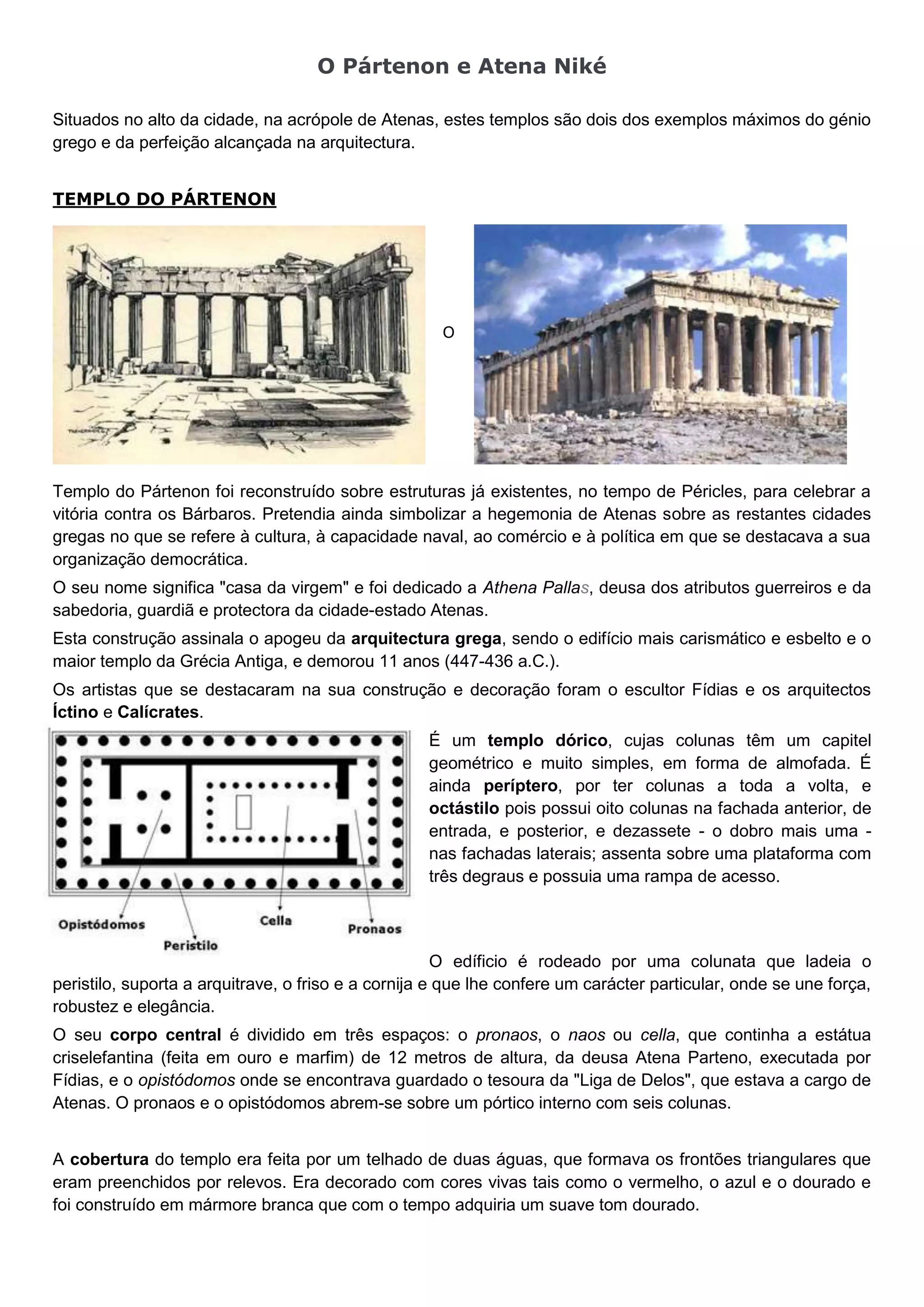O Pártenon e Atena Niké são dois templos situados na Acrópole de Atenas. O Pártenon foi construído no século V a.C. para celebrar a vitória sobre os persas e simbolizar a hegemonia de Atenas. É um templo dórico decorado com esculturas que descrevem batalhas míticas. O Templo de Atena Niké foi construído no século V a.C. também e é mais pequeno, com decoração jónica incluindo cenas das guerras grego-persas.