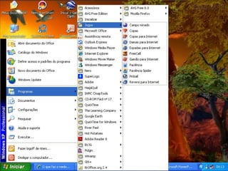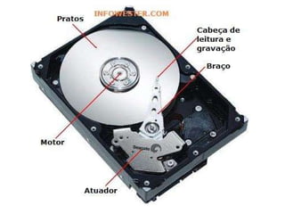 O documento descreve os principais componentes de hardware e software de um computador. No hardware, destaca-se o gabinete, a placa-mãe, o processador e o disco rígido. Já no software, enfatiza-se que se trata de um conjunto de instruções executadas pelo computador para produzir determinada função, diferente do hardware que é a parte física da máquina.
