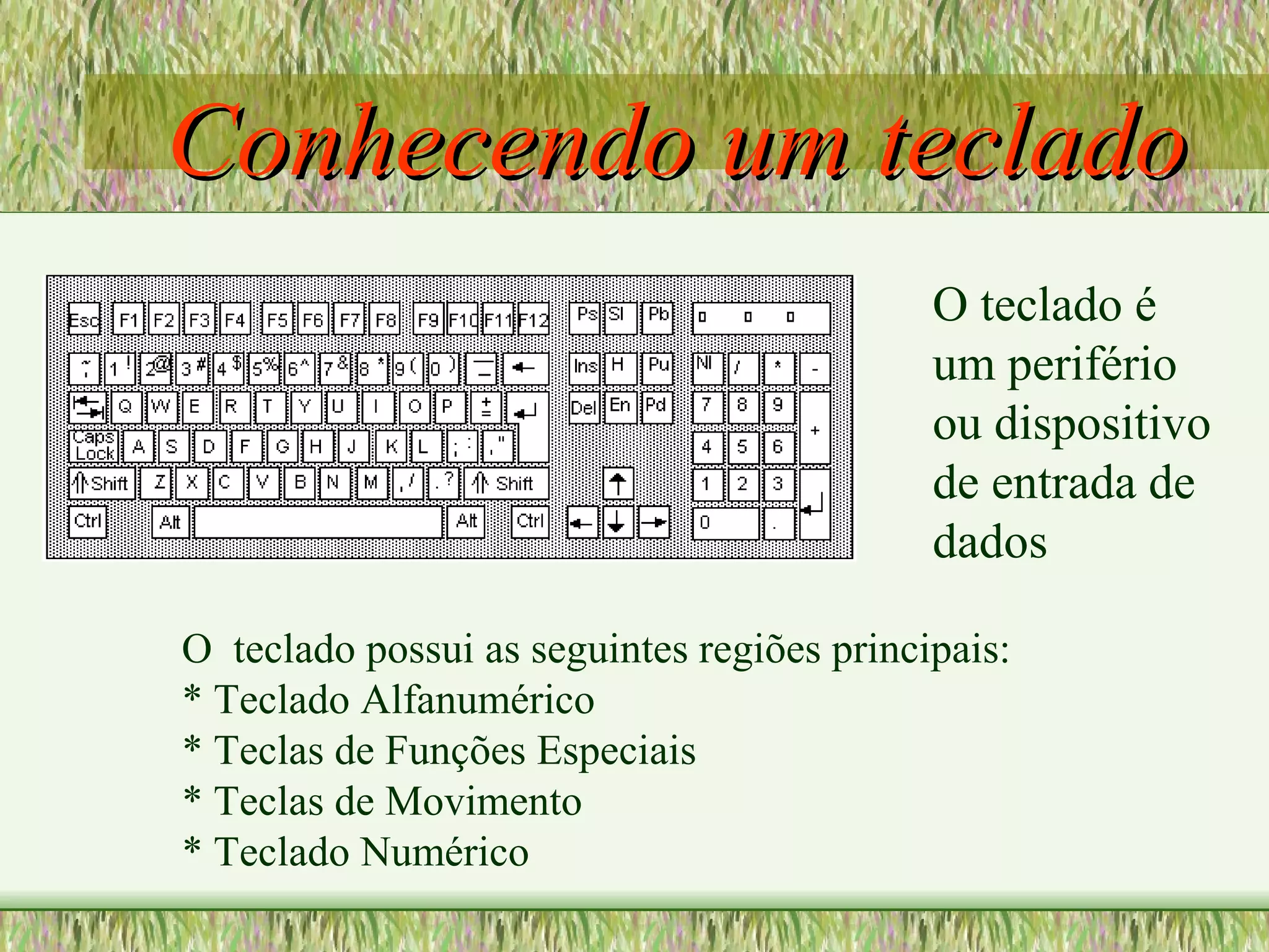 O documento descreve as principais partes de um teclado de computador, incluindo o teclado alfanumérico, teclas de funções especiais, teclas de movimento e teclado numérico. Ele explica as funções das teclas como SHIFT, CAPS LOCK, BACKSPACE, ENTER, teclas de função F1-F12, ALT, CTRL e teclas de seta e movimentação. O documento também discute o propósito do teclado numérico e a tecla NUM LOCK.